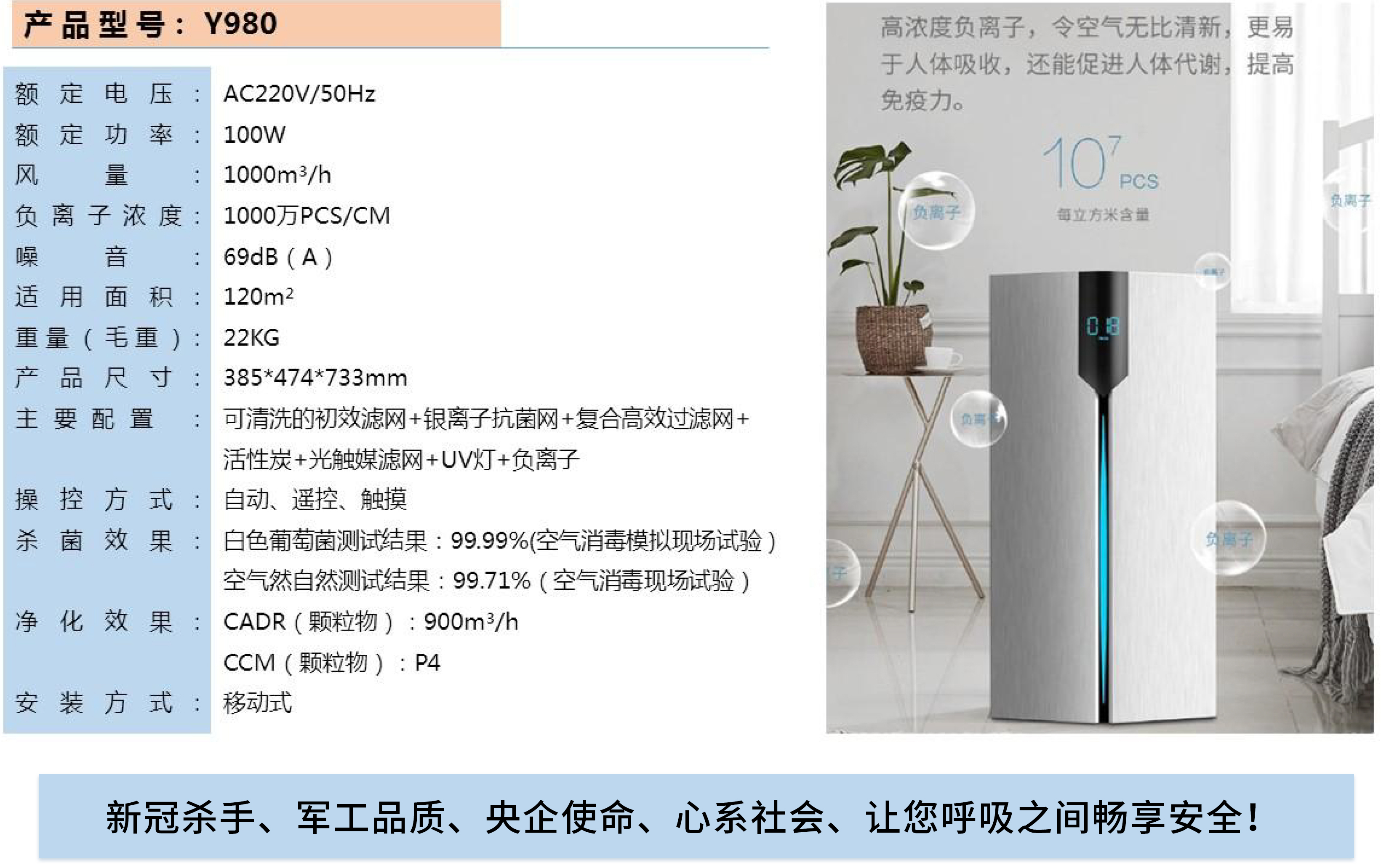 Y980 air disinfection machine is a collection of purification and filtration + deep ultraviolet sterilization + negative ion in addition to taste, a number of technology set in one, it can not only kill bacteria, viruses, mold and other bacteria and viruses, but also can remove indoor air formaldehyde and other organic pollution gas, as well as filter pollen and other allergens. At the same time, it can also effectively remove the smoke and the smell alongwith life odor.Air disinfection machine through iteration, constantly updated its sterilization effect is reliable, and can carry on the air disinfection in the case of human activity, human coexistence.